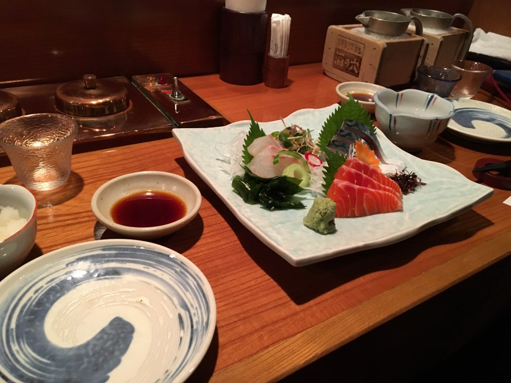 While we dined and sipped we also tried some of the bar’s sashimi. The salmon, white fish and mackerel offered were, I dare say, superior in flavor to what I had in the morning in Tsukiji; more rounded and with the umph of a nice umami – to which Jeff commenting that there must be something wrong with my taste buds.