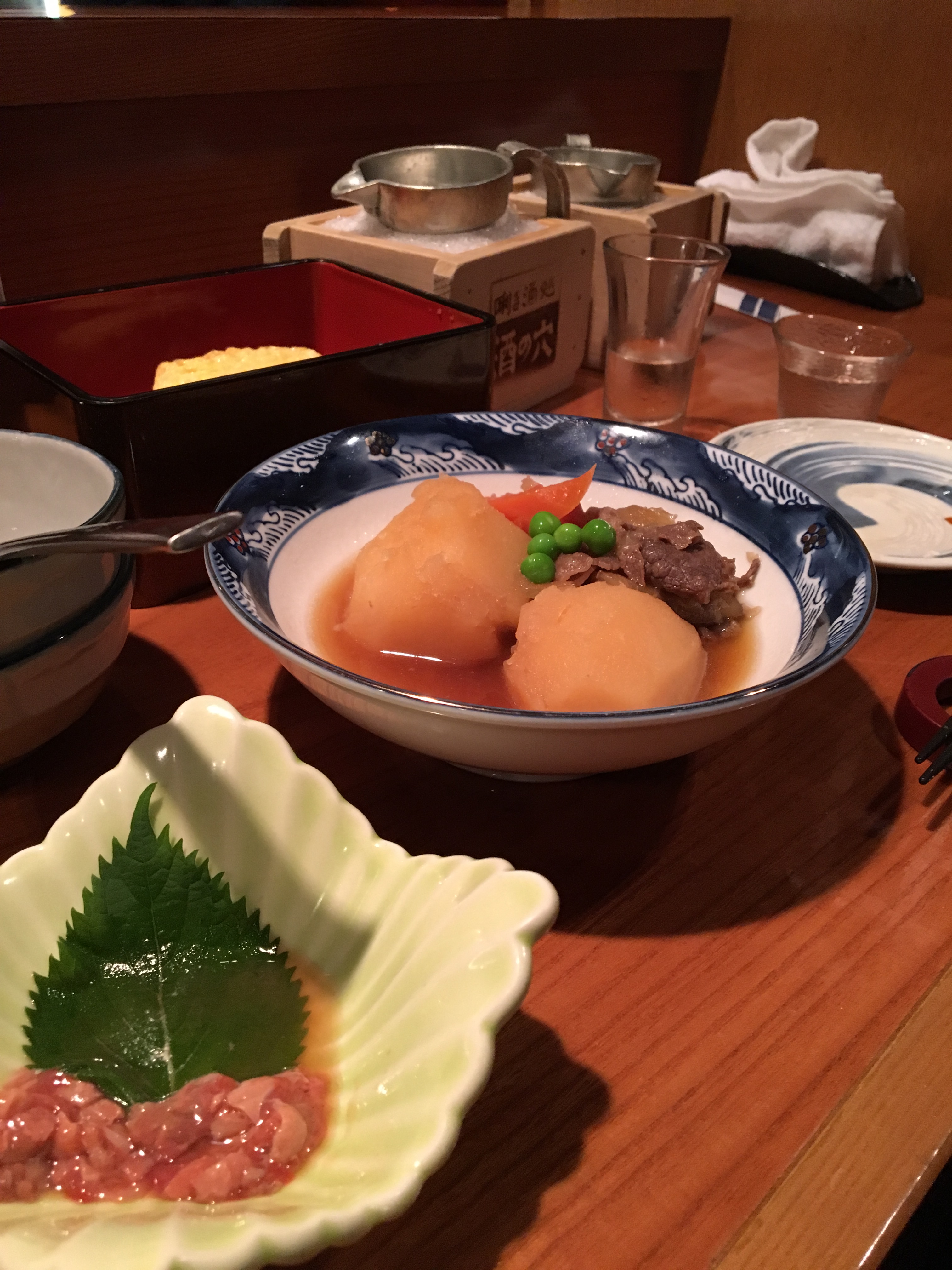 After awhile we ordered a third sake, Yorokobi Gaijin, which was my favorite of the bunch. The nose and palate were robust, with a somewhat thicker mouthfeel and hints of cocoa powder and chocolate truffle. Jeff paired this with Tamagoyaki, a traditional Japanese egg dish of layered egg that was light and flavorful, and cream cheese with bits of squid, which worked to enhance the chocolate flavor I was experiencing in the sake. Before our bill arrived and we left for the evening, we were served one final dish: two gargantuan potatoes with beef, what Jeff referred to as true Japanese comfort food. The beef itself was good but the potatoes were otherworldly and quintessentially Japanese, with a light sweetness to them from the fish broth in which they had been cooked. A perfect and filling end to the tasting.