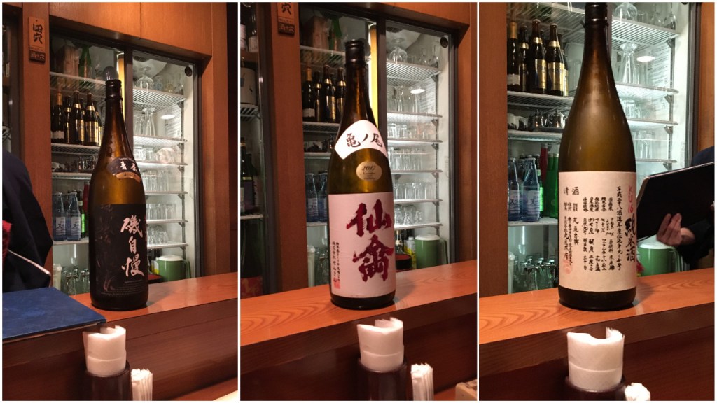 The next bottle was a slightly fruitier option. Senkin had a lively floral and fruity nose, a bit intense on the palate but still wonderful. Our journey wasn’t complete without small snacks to accompany our impromptu tasting: the waitress serving us, clad in a navy blue kimono, soon approached with a round serving platter covered with small blue bowls filled with three varieties of snacks. Jeff took a bowl of chicken while I took a bowl of pickled vegetables with fresh grated wasabi, nothing short of spicy and amazing.