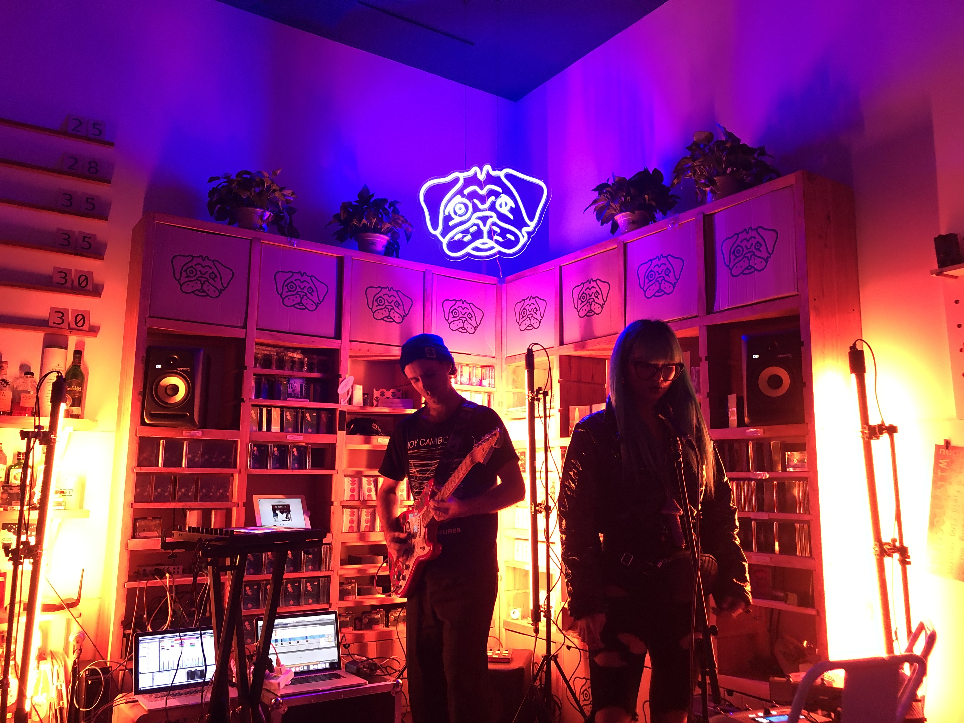 Visiting artists play while bathed in soothing purple from the neon pug-shaped sign right above the stage, which is a simple nook in the right hand corner of the shop. It’s here that Jen and Dave were able to find a new home for their recording studio, designed with help from thruoutin. “There’s a secret door behind the bar that leads to a fully sound-proofed professional recording studio” exclaims Jen.