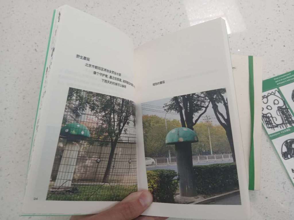 I first became aware of the vents – white tubes topped with green or red domes with holes on the underside that churn out steam in winter – when I stumbled across a zine detailing the mysterious vents titled Beijing Mushroom Field Guide (北京蘑菇寻找指南 Běijīng Mógū XúnzhǎoZhǐnán, updated copy pictured below), written by a certain Yu Gong. Inside was a detailed map showing where vents could be found, and even stickers you could doodle on and paste on the objects.